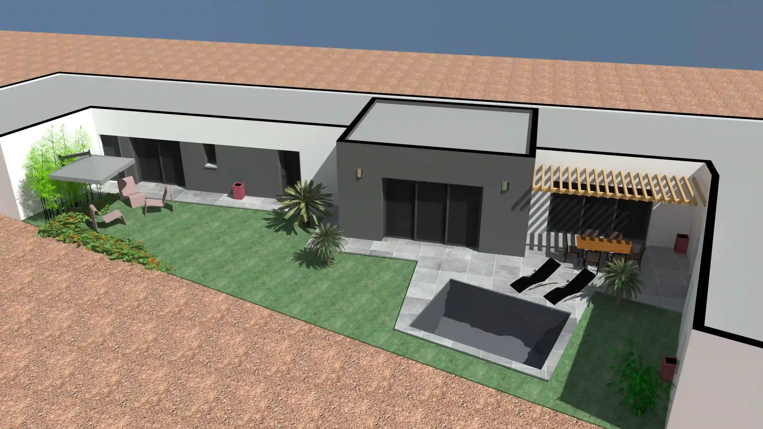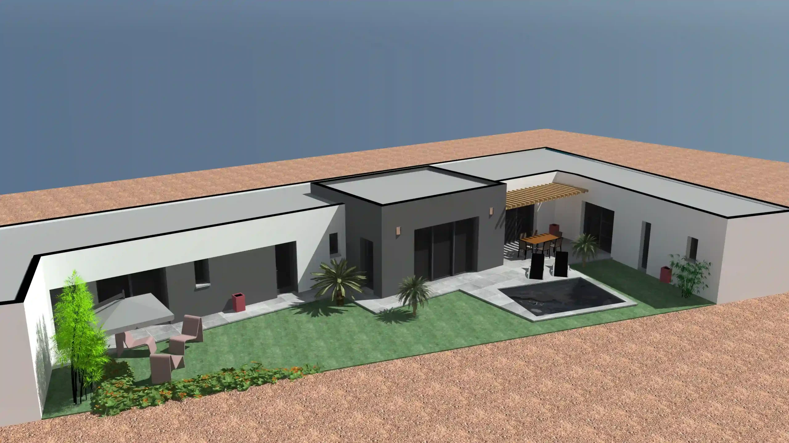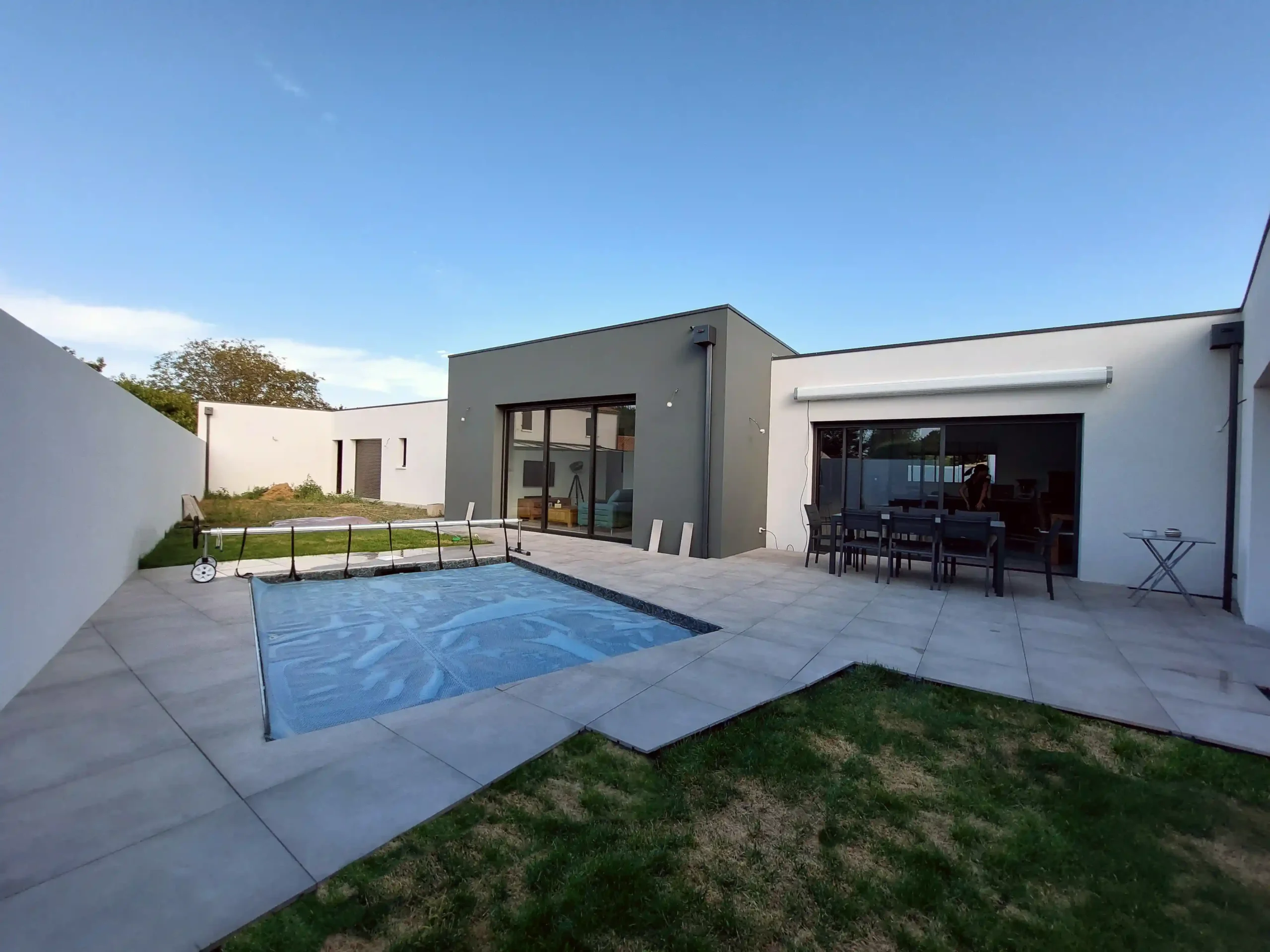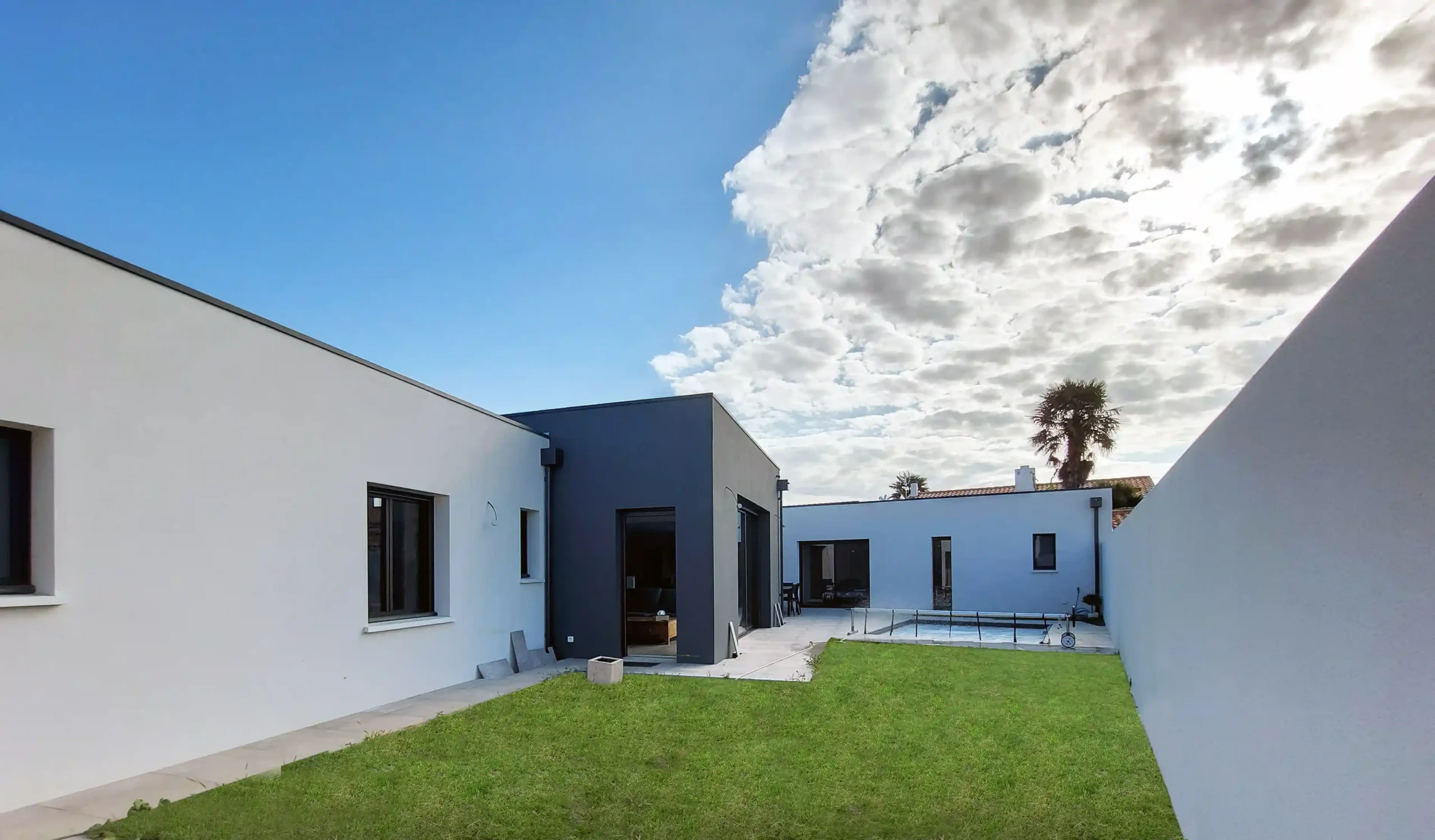 Cette construction neuve à Dompierre propose une architecture élégante articulée autour d’un patio central avec piscine. Le jeu de volumes, associant façades blanches et bloc gris contrasté, offre une écriture moderne et parfaitement intégrée au terrain. Les grandes baies vitrées structurent les espaces de vie et créent une continuité naturelle vers la terrasse carrelée et le jardin. À l’intérieur, la pièce principale s’organise autour d’une cuisine conviviale et d’un espace repas lumineux, tandis que les circulations ont été pensées pour privilégier l’intimité des chambres. L’ensemble compose une maison fonctionnelle, chaleureuse et contemporaine, entièrement tournée vers l’extérieur et le confort quotidien.