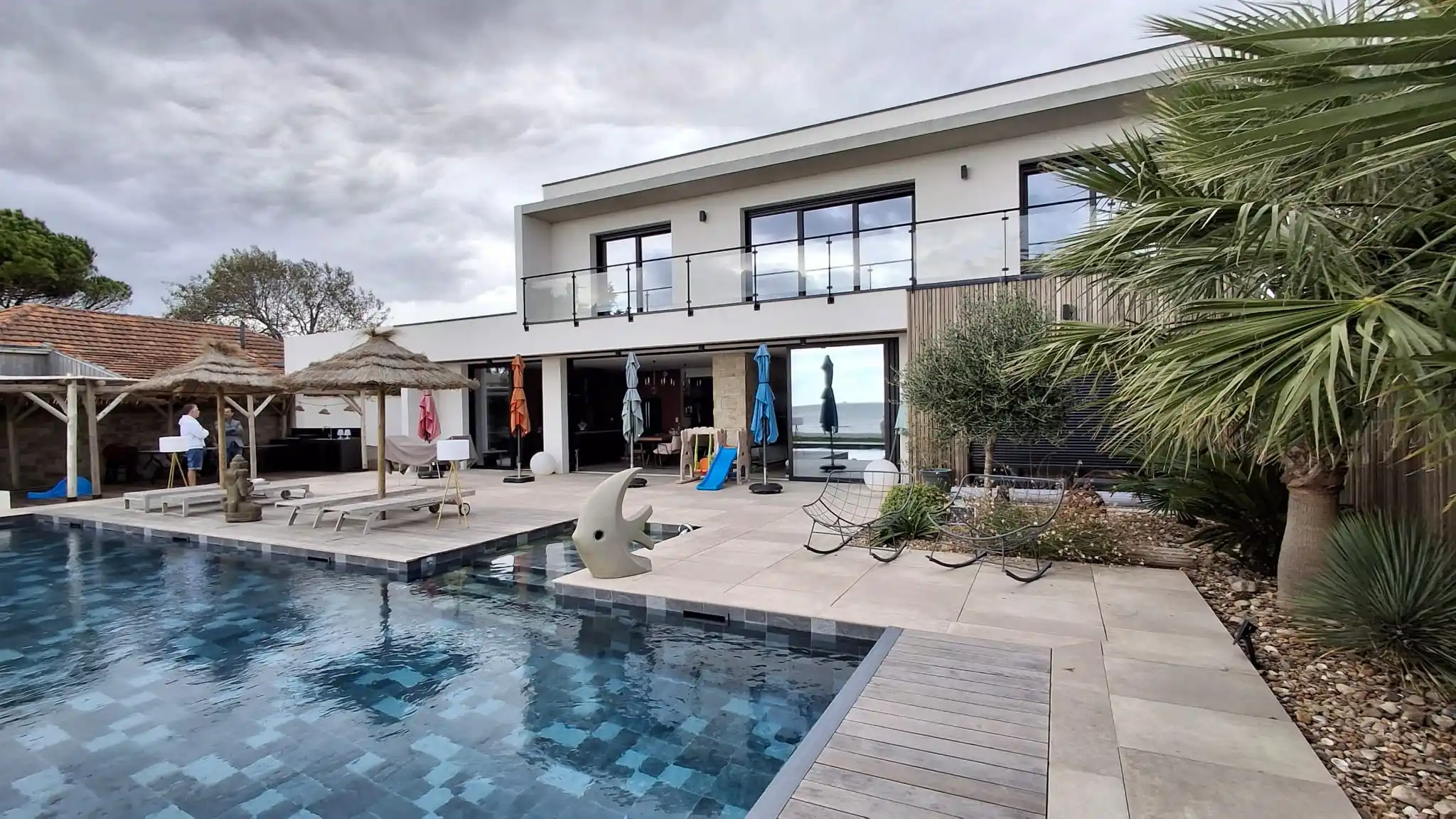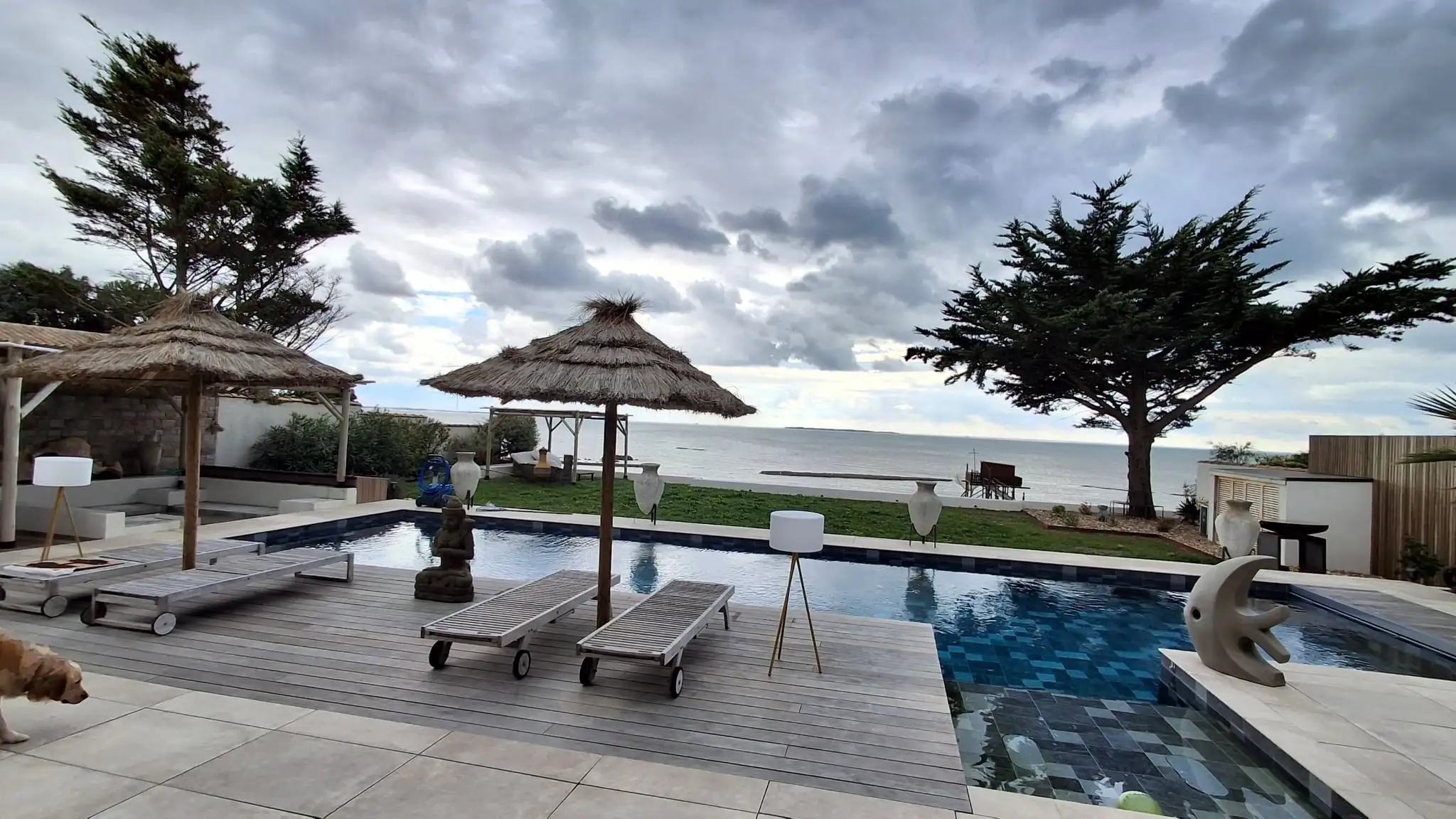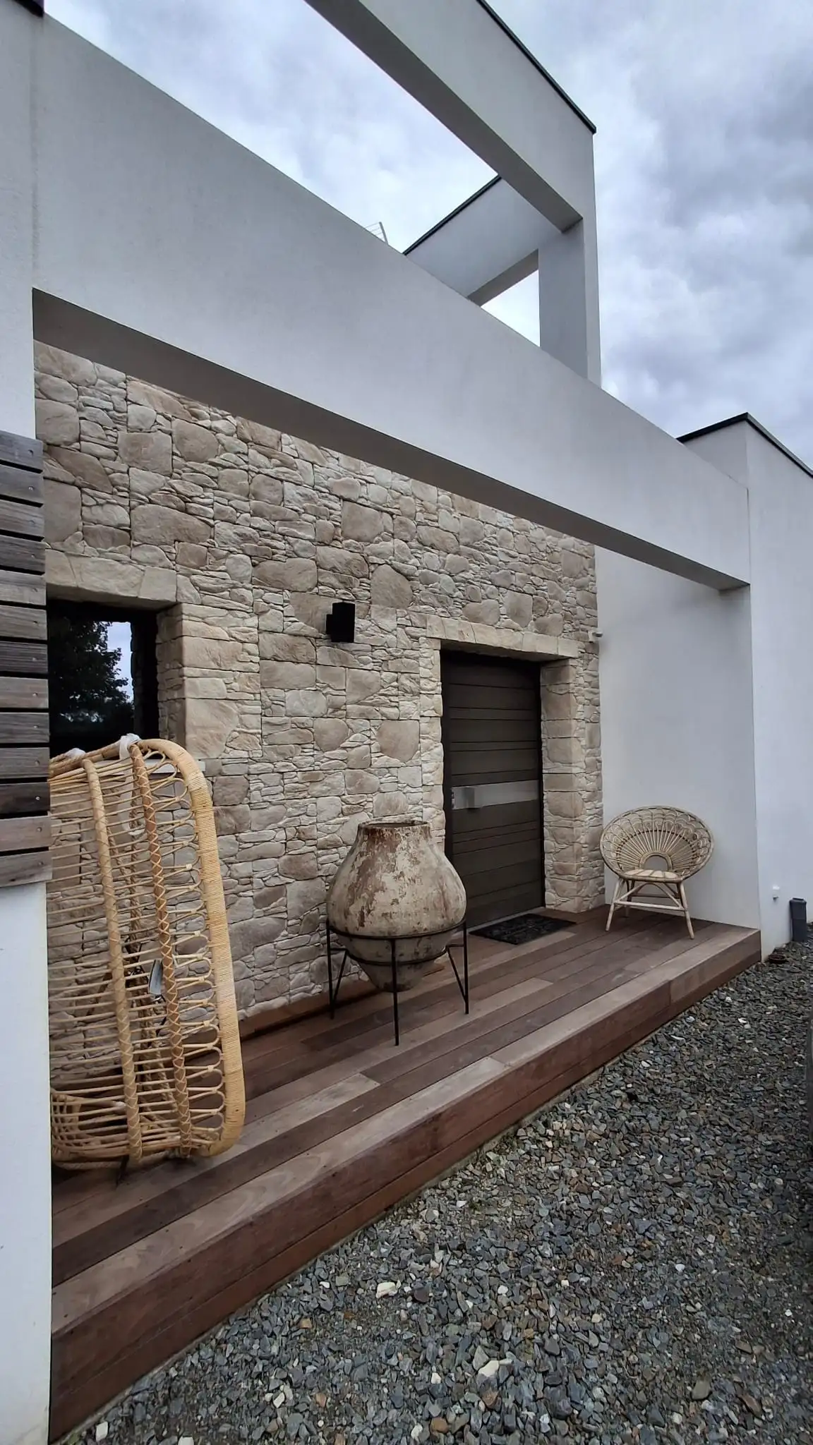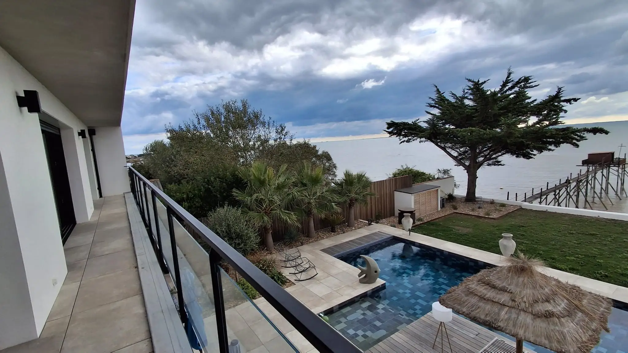 Cette construction d’une maison en Charente-Maritime se distingue par une architecture contemporaine pensée pour magnifier son environnement littoral. Les lignes épurées du bâti, les façades immaculées et les menuiseries aluminium XXL ouvrent généreusement l’intérieur sur l’océan, créant une continuité naturelle entre les espaces de vie et l’extérieur. À l’intérieur, chaque détail a été soigneusement étudié : murs en parement de pierre, escalier graphique, cuisine sur mesure et matériaux nobles qui confèrent à l’ensemble une atmosphère chaleureuse et raffinée. La piscine paysagée, le vaste deck en bois et les aménagements extérieurs prolongent l’expérience, transformant la maison en véritable lieu de vie tourné vers la mer. Cette réalisation incarne l’équilibre parfait entre design contemporain, confort durable et élégance balnéaire.