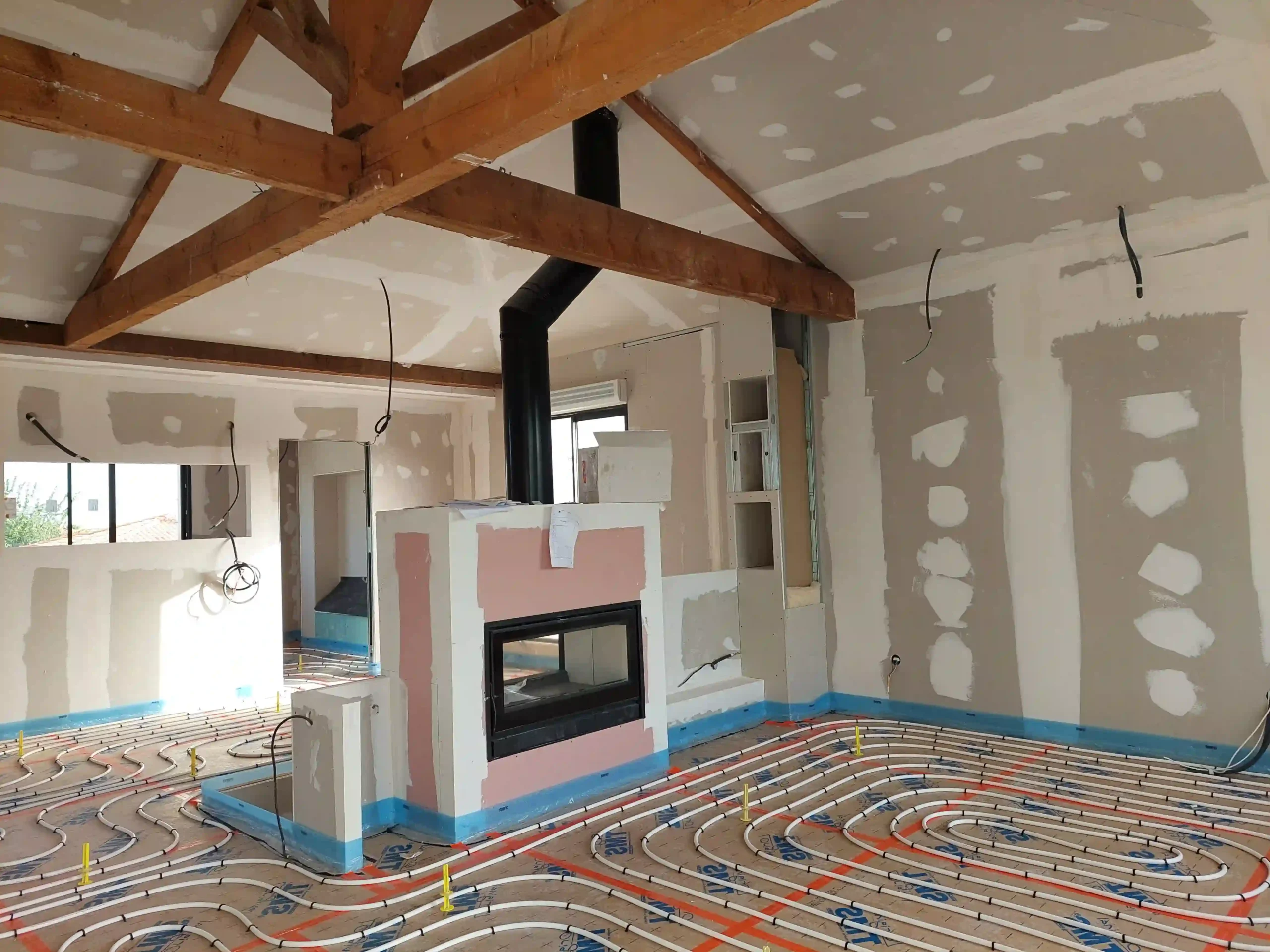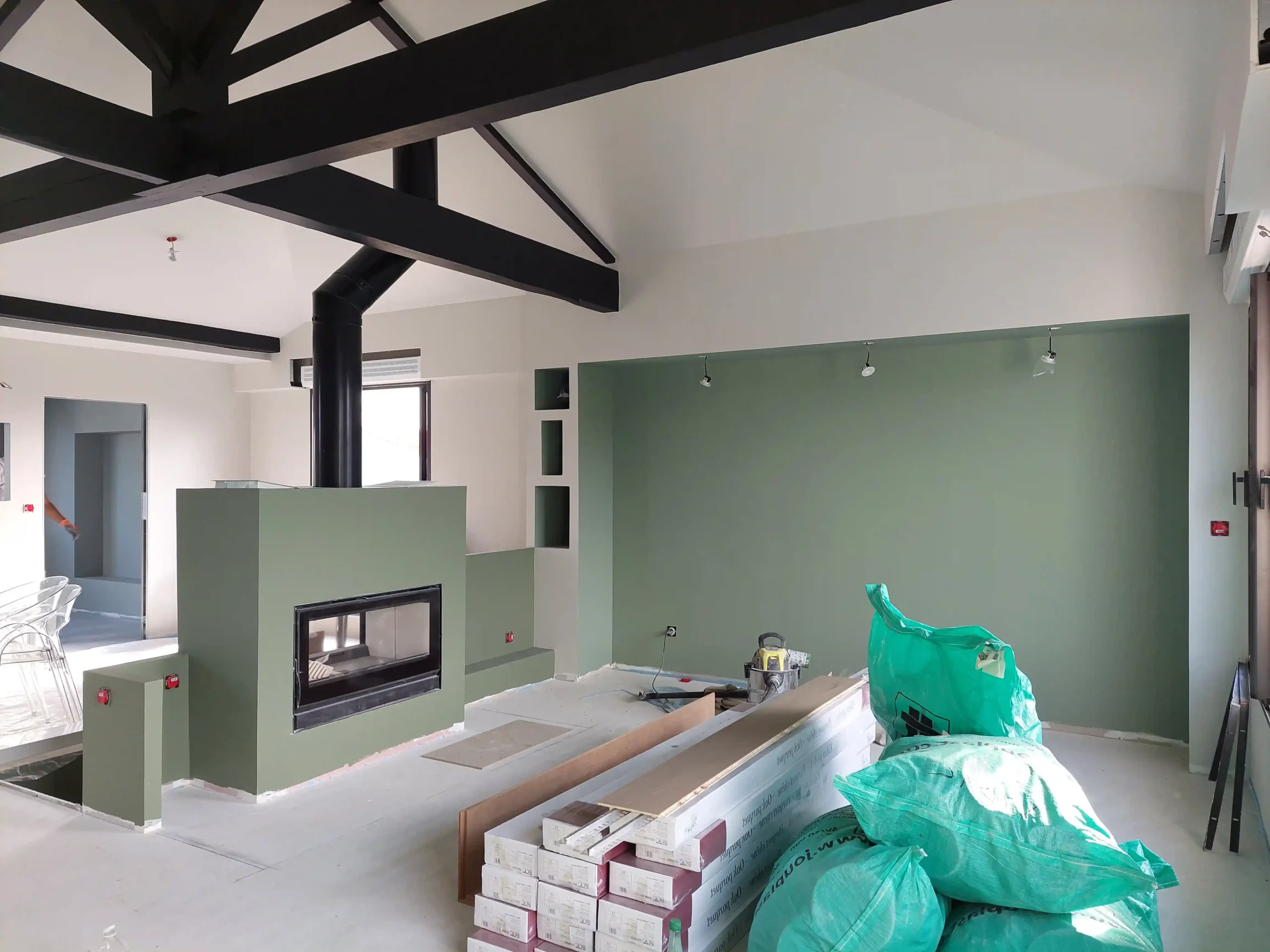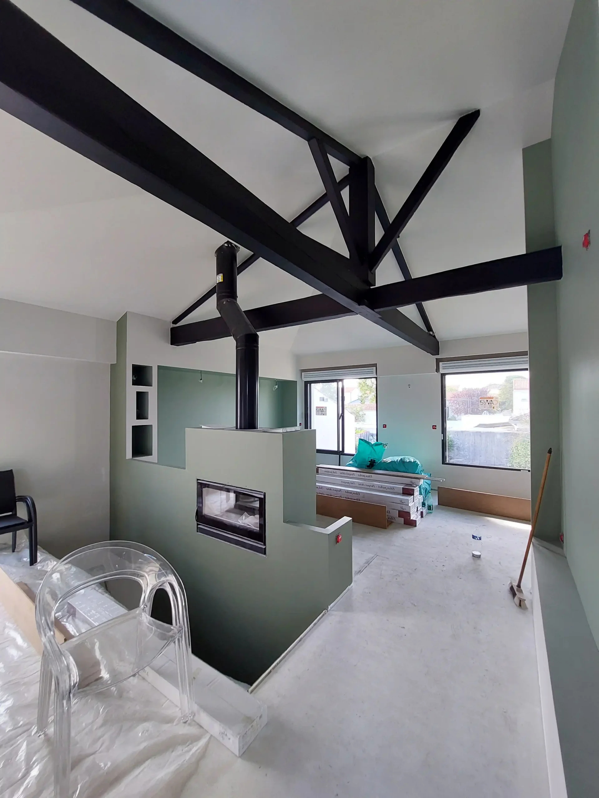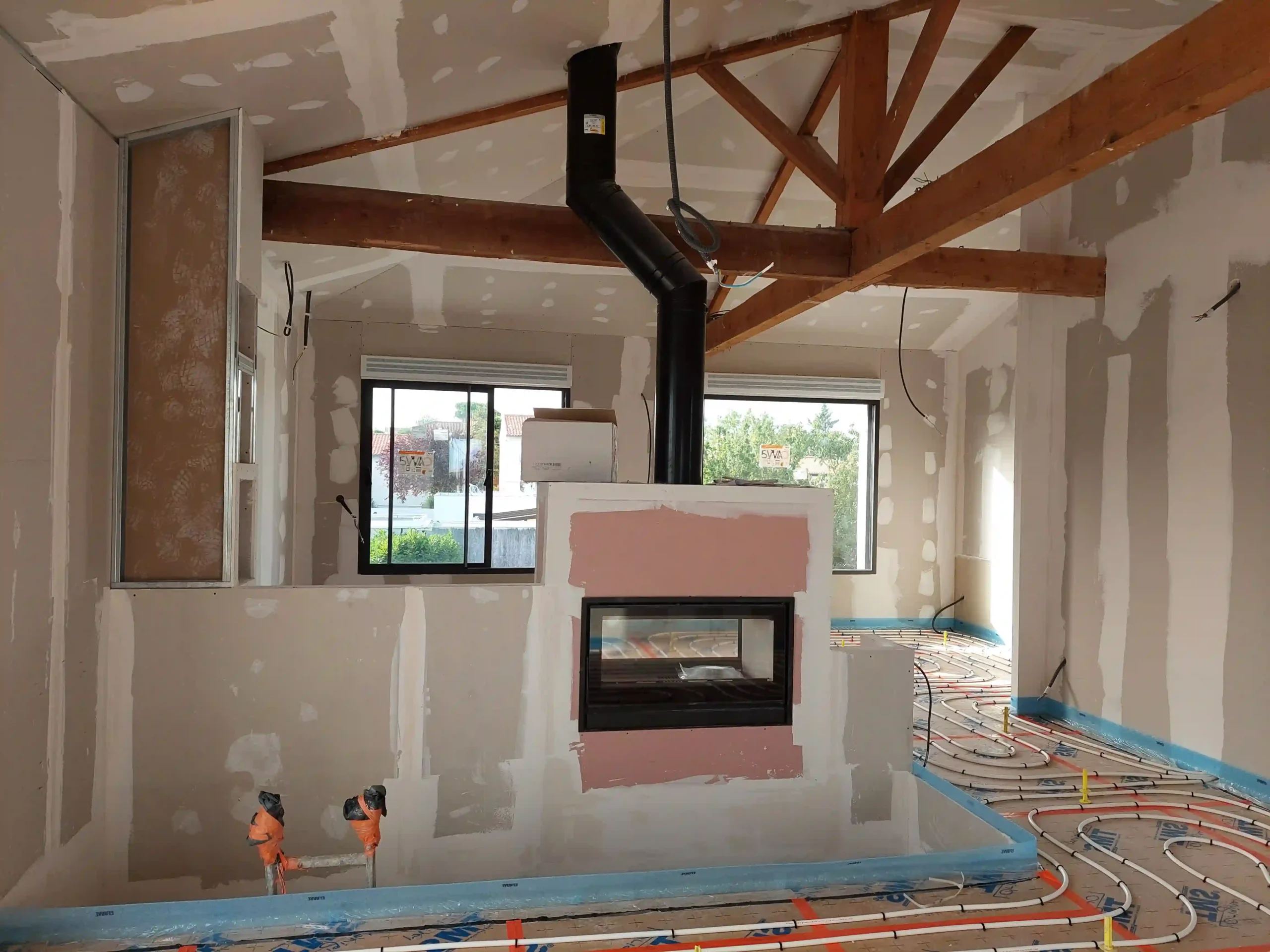 Cette construction d’une maison à Bourgneuf incarne une approche contemporaine du confort, conçue pour offrir des espaces lumineux et fonctionnels. La pièce de vie centrale,